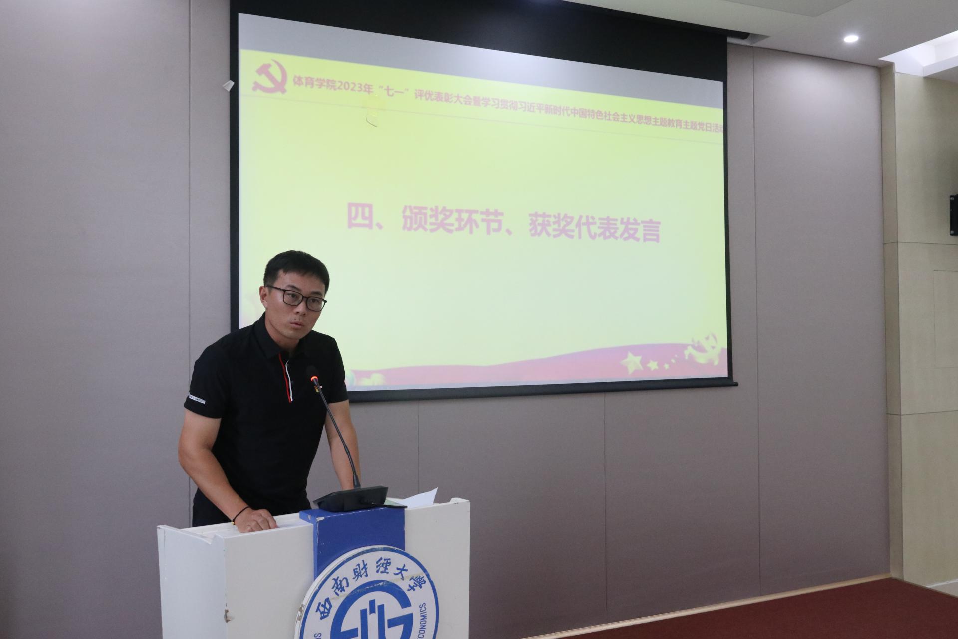 党委书记周正宏在发言中简要总结过去一年在学校党委的坚强领导下,西财体育人全面贯彻党的二十大精神、推动学院事业高质量发展取得的阶段性成果,并向奋斗在一线的师生党员致以诚挚的问候,向受到表彰的师生党员表示热烈祝贺。周正宏指出,学院党委坚持把高质量开展好主题教育作为重大政治责任,迅速行动、精心组织,坚持高标准、严要求,在深入推进理论学习、调查研究、推动发展、检视整改等方面取得了积极进展。就进一步推动主题教育走深走实,周正宏提出“四心”的工作要求,希望全体师生党员始终保持学习心、忠诚心、实干心、奋进心,在“学思想”中擦亮信仰底色,在“强党性”中擦亮忠诚底色,在“重实践”中擦亮公仆底色,在“建新功”中擦亮拼搏底色,在新征程学院体育事业高质量发展贡献力量、再立新功。