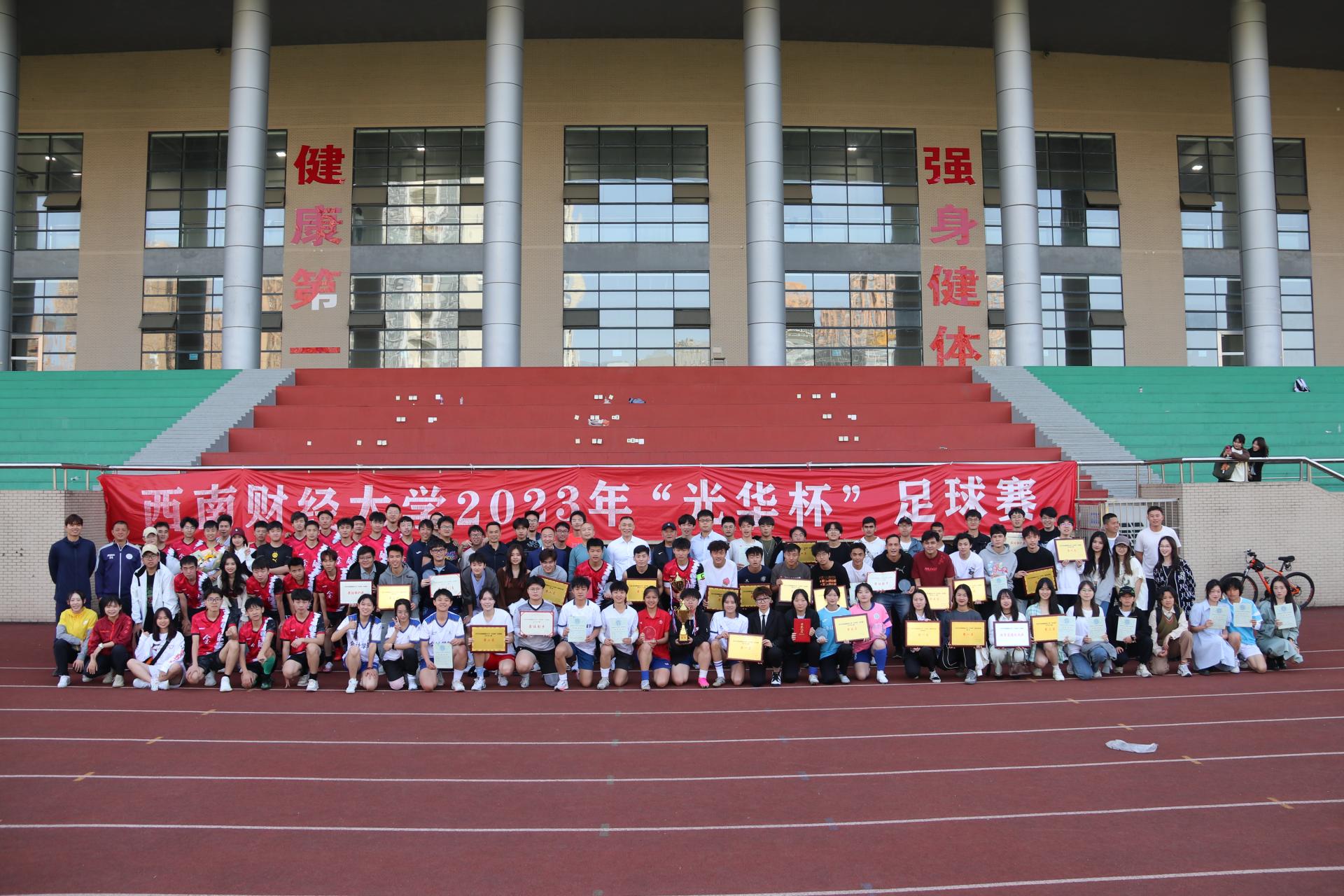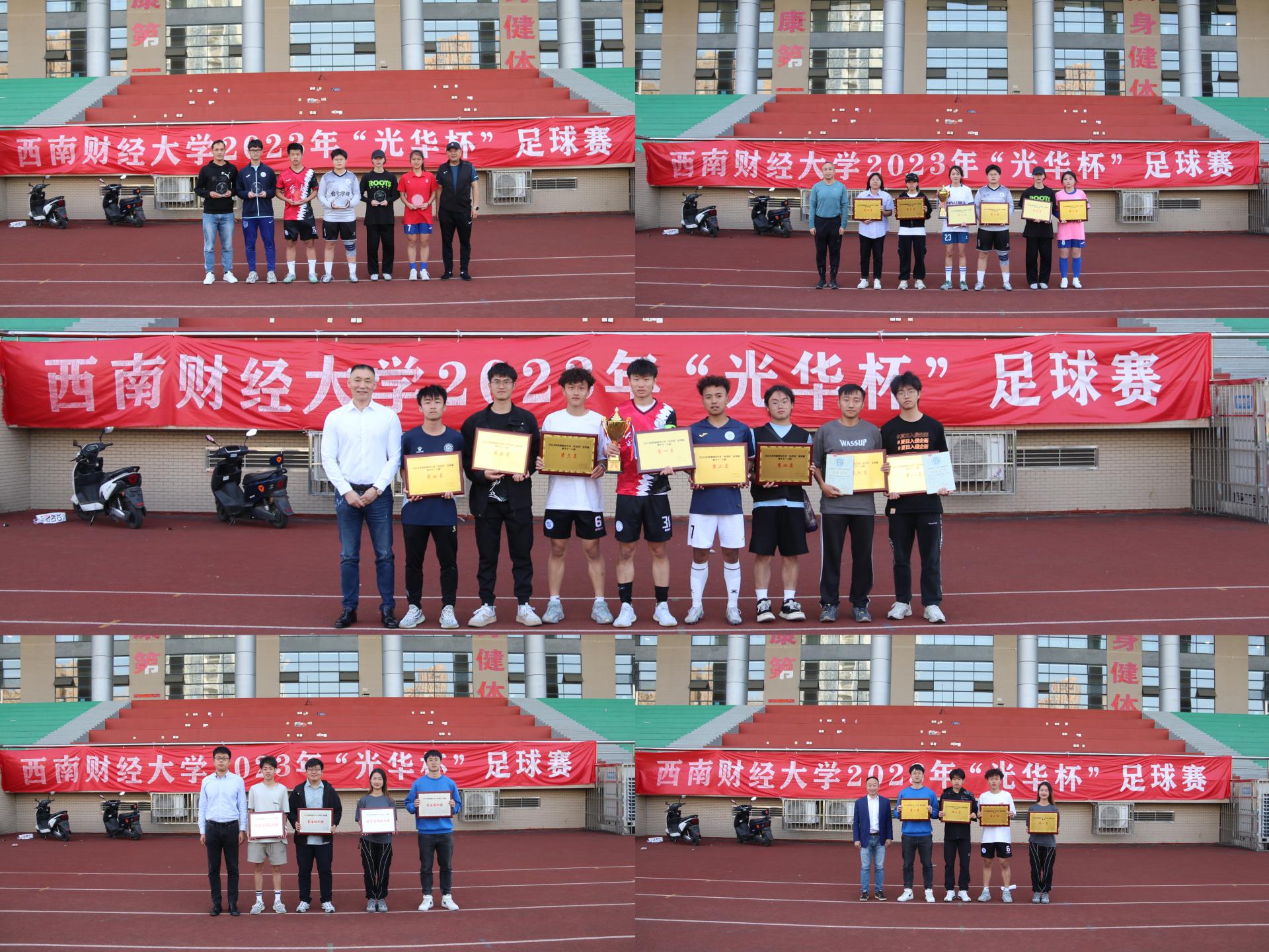 4月25日下午“礼赞新时代·奋进新征程,迎大运·迎百年校庆”2023年西南财经大学“光华杯”足球比赛颁奖仪式在晨曦足球场举行。J9九游登录(中国)有限公司官网院长杨远波,学院党委书记周正宏,副院长阴涛、陈丛刊,副书记李治为获奖学院以及个人颁发了荣誉证书及奖牌。