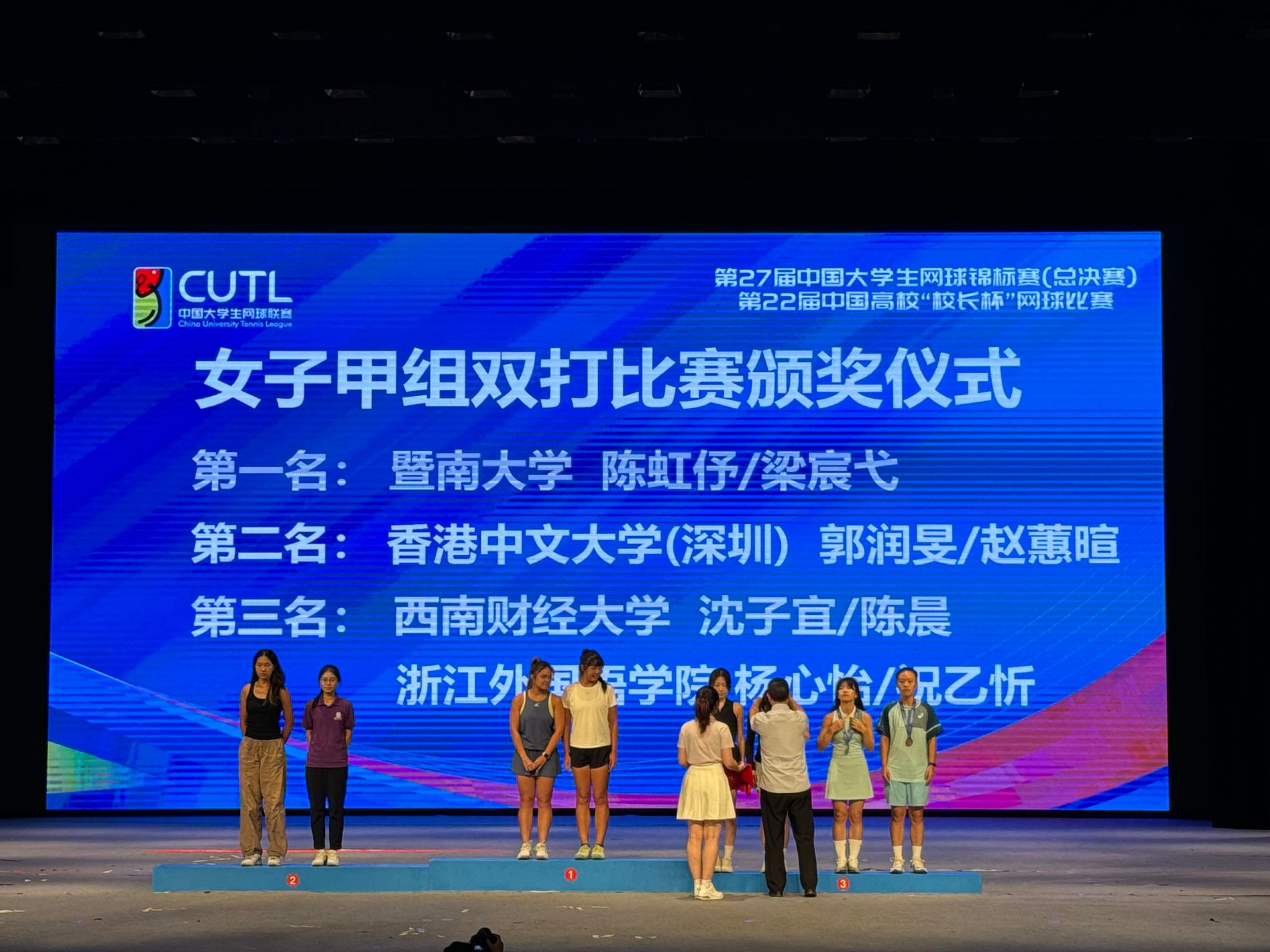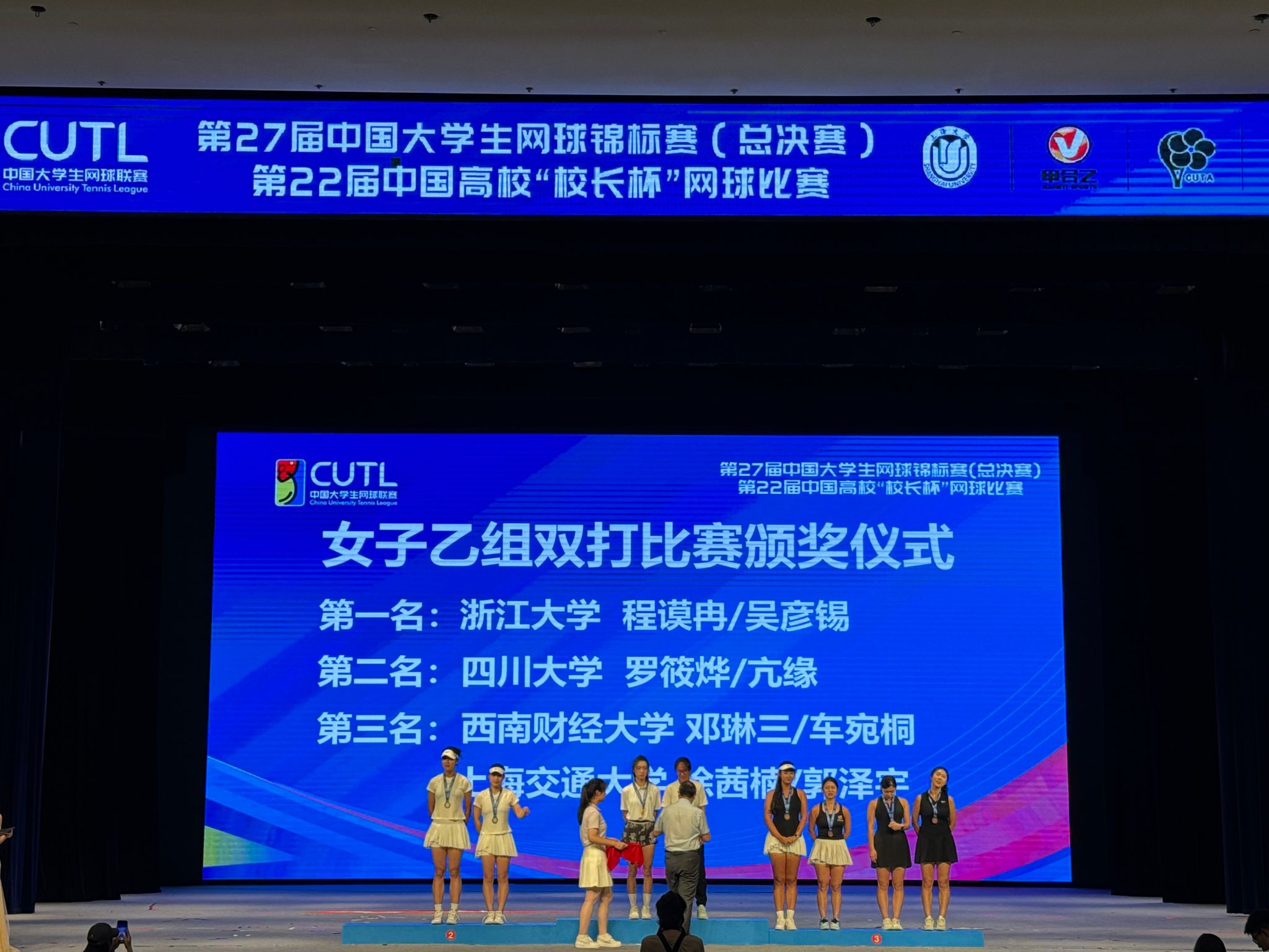 7月22日-8月1日,第27届中国大学生网球锦标赛(总决赛)在上海大学(宝山校区)举行。中国大学生网球锦标赛是我国大学生层面最顶级的网球赛事,经过八大分区赛的激烈角逐,在本届中国大学生网球锦标赛(总决赛)中,共有来自全国132所高校的915名同学成功晋级总决赛。参赛规模创历史新高!J9九游登录(中国)有限公司官网网球队在前期分区赛上表现突出,成功晋级总决赛,11名运动员代表学校参赛,孙巨杉、施泓宇、孔星宇担任教练。经过八天的激烈角逐,西财健儿们在强手如林的赛场上顽强拼搏,团结奋进,获得女子普通高校甲组双打季军和女子高水平乙组双打季军的好成绩,充分展现了西财学子的精神风貌和青春风采,为即将到来的西财百年华诞献礼!