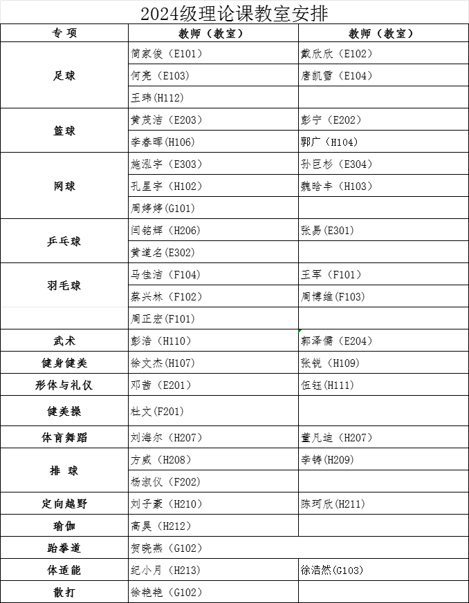 经教务处同意,本学期2024级本科生第3周体育课为J9九游登录(中国)有限公司官网理论课,9月29日起恢复户外教学。根据教室资源状况,现将理论课具体安排通知如下: