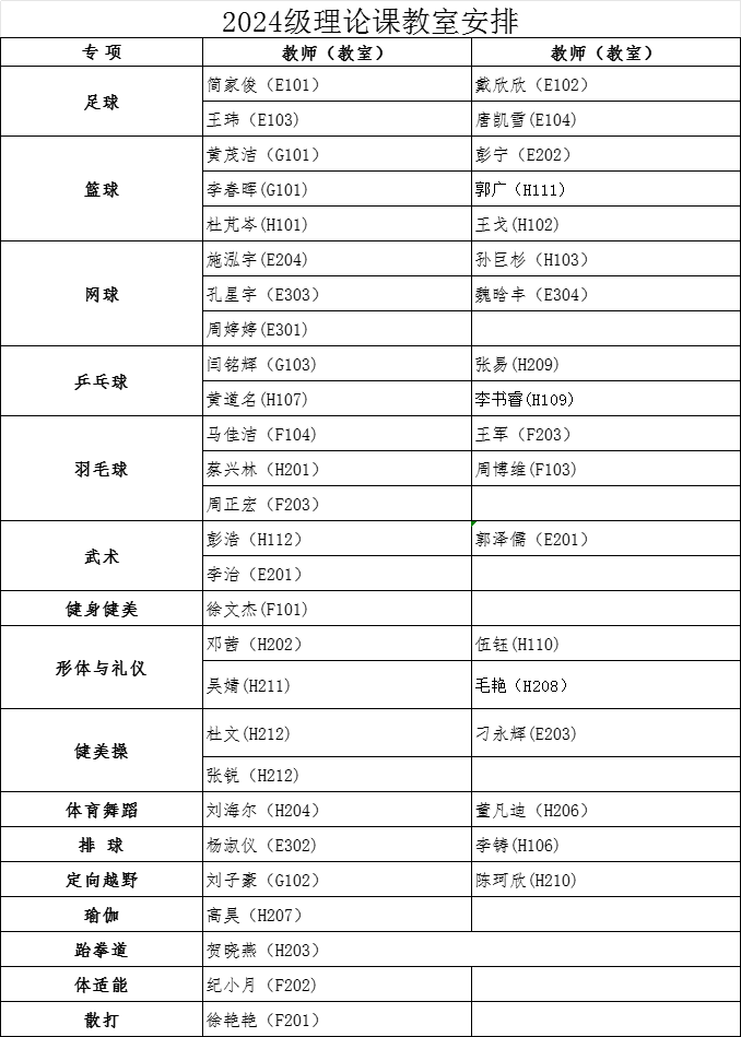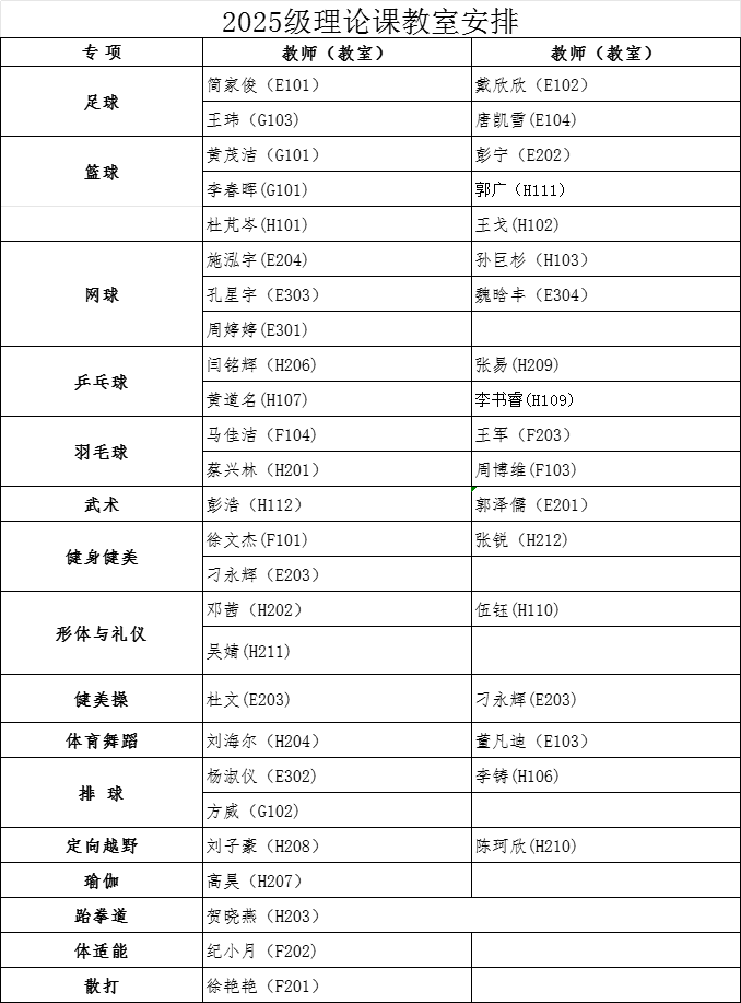 经教务处同意,本学期2024级、2025级本科生第13周体育课为J9九游登录(中国)有限公司官网理论课,12月8日起恢复户外教学。根据教室资源状况,现将理论课具体安排通知如下:
