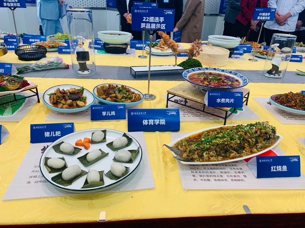 此次大赛由各学院派出一支代表队参赛,参赛队伍需在三个小时之内利用学校提供的食物及材料将规定的菜品全部制作完成,已超时的菜品不参加评比。我院代表队参赛学生分工明确、合作默契,精心烹饪推出了芋儿鸡、水煮肉片、红烧鱼和叶儿粑等传统川菜菜品,将地道纯正的川菜色香味体现出来,弘扬川菜传统文化。我院参赛代表队用时两小时十分钟,在规定时间内出色地完成了任务。评委们根据菜品品质、操作流程等方面进行综合评分,评出“劳动最美丽”一等奖、二等奖、三等奖,“最佳创意”,“最佳团队”等奖项。经过紧张激烈角逐,我院代表队最终取得团体三等奖的好成绩。
